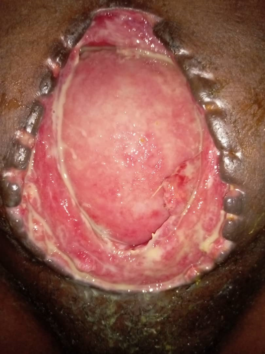 The early postoperative course was initially uneventful. The nasogastric tube and pelvic drain were removed on postoperative day (POD) 3, and oral feeding resumed. Antibiotics were continued for 7 days. On POD 7, the surgical wound exhibited signs of infection, including erythema, purulent discharge, and leakage of enteric contents. By POD 10, complete fascial dehiscence occurred, resulting in an open abdomen with a high-output entero-atmospheric fistula (3,000 mL/day) and exposed gravid uterus (Figure 1).