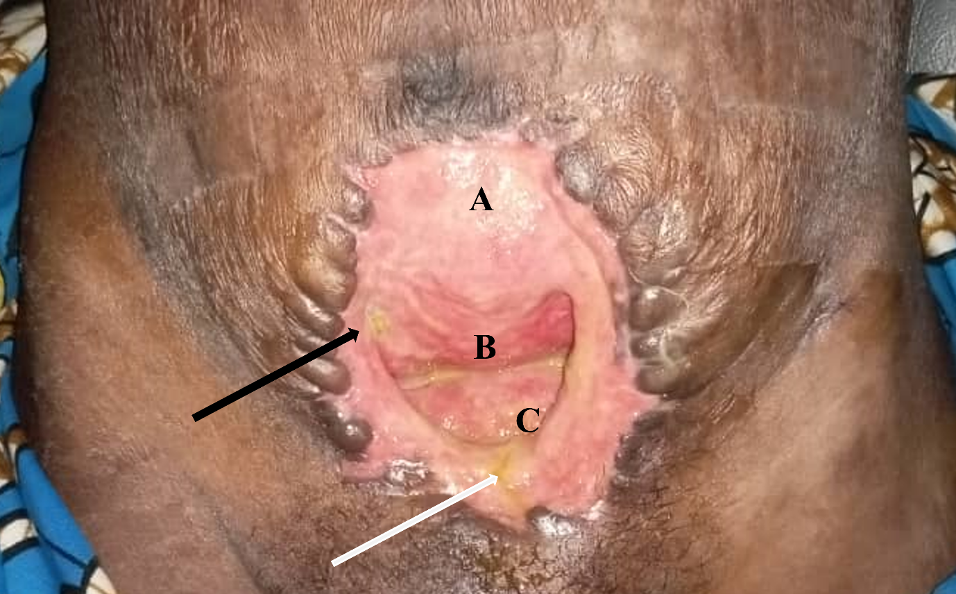 Conservative management was initiated due to limited resources. A low-fiber diet and loperamide (4 mg orally four times daily) were administered to reduce intestinal motility and fistula output. In the absence of laboratory capacity for electrolyte monitoring, hydration status was assessed clinically via urine output, skin turgor, and vital signs. Empiric potassium supplementation (0.5 mEq/kg/day IV) was maintained with adjustments based on clinical indicators of dehydration or cardiac rhythm irregularities. Daily wound care involved saline-soaked gauze dressings coated with petroleum jelly to protect peri-fistula skin from caustic effluent. Over subsequent weeks, fistula output gradually decreased to 300–500 mL/day with progressive granulation tissue formation around the wound edges.