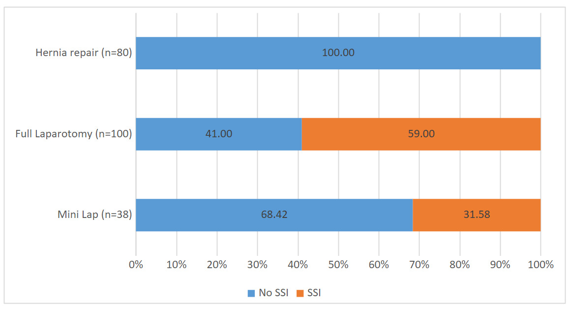 SSI distribution varied significantly by type of surgery (Figure 1): 59% after laparotomy (vs. 0% for hernia repairs, P < .0001) and 31.6% after mini-laparotomy.