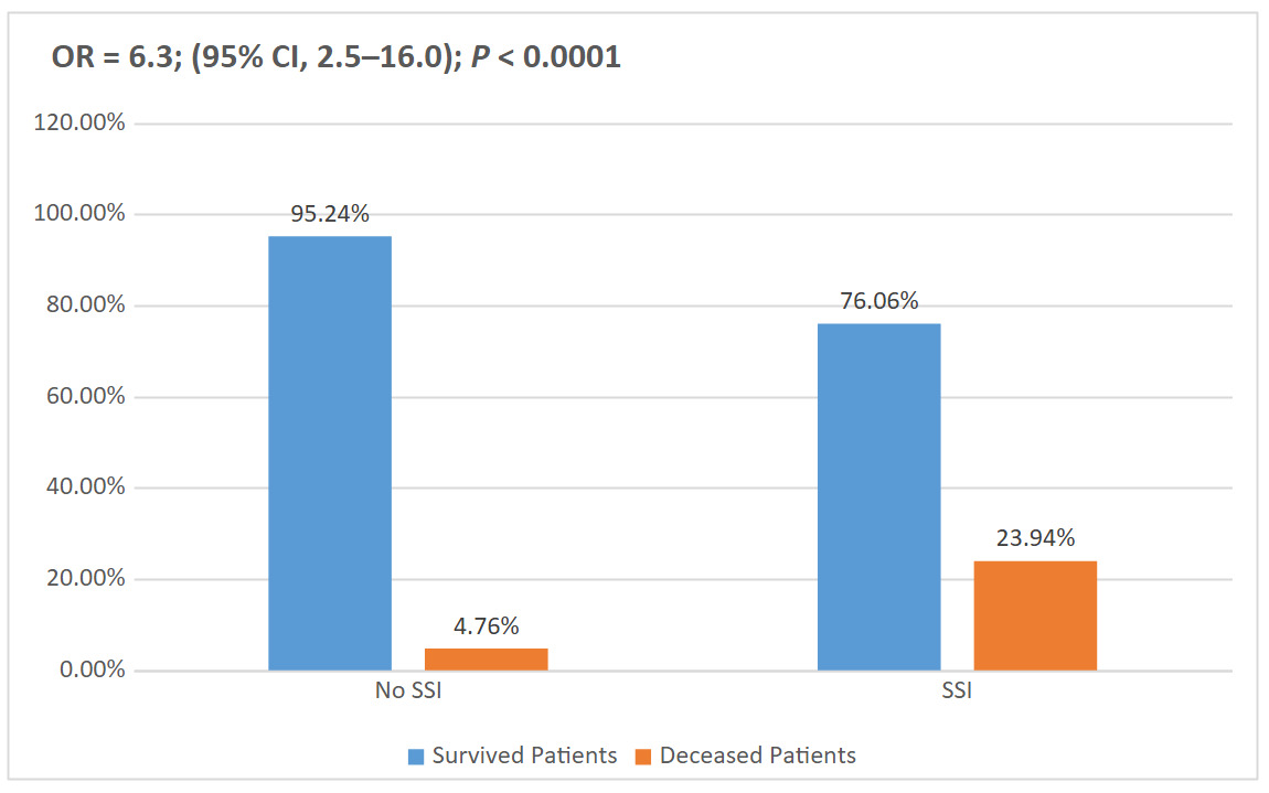 Of the 218 patients, 194 (89.0%) survived and 24 (11.0%) died. A marked disparity was observed between the groups without SSI (survival: 95.24%) and with SSI (survival: 76.06%; death: 23.94%). The analysis reveals a significant association between SSIs and postoperative mortality (odds ratio [OR] = 6.3; 95% confidence interval [CI], 2.5–16.0; P < .0001), as illustrated in Figure 2.