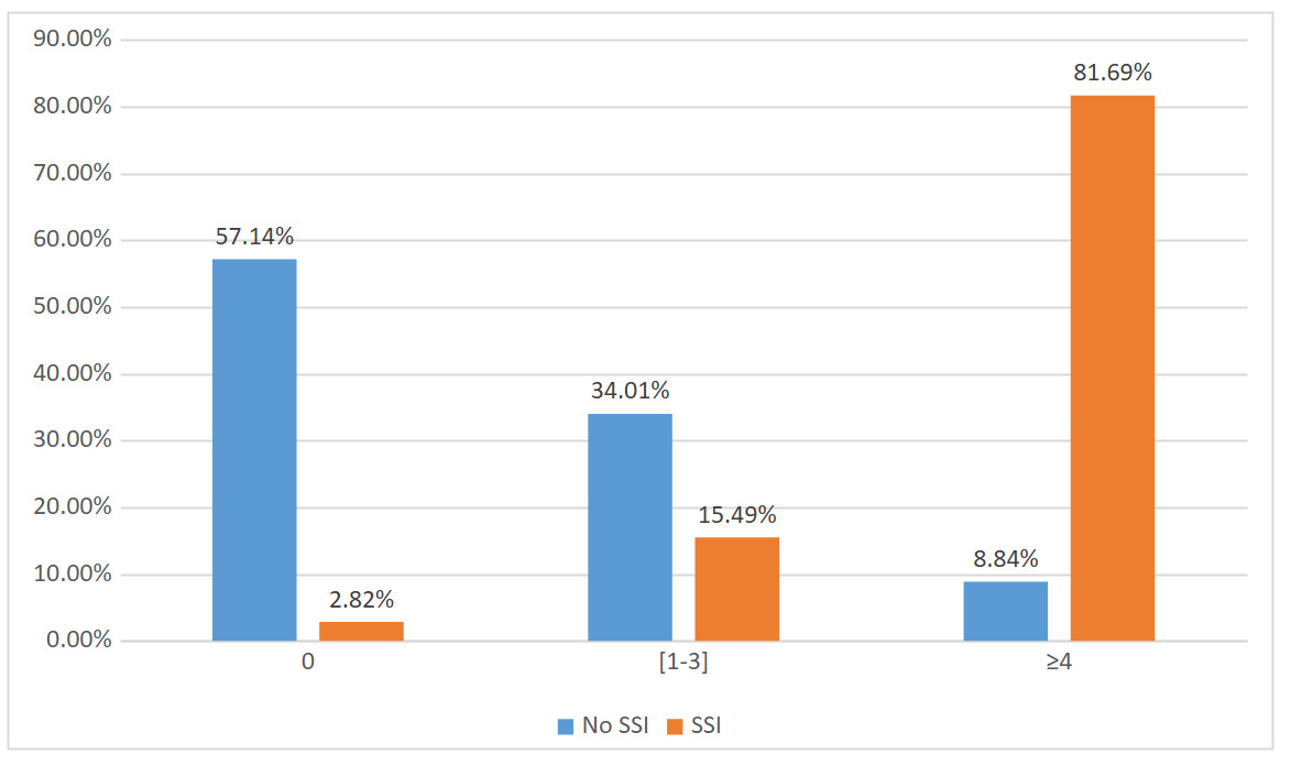 The average SSI risk score was 2.3 ± 2.4 for all patients. A significant difference was observed between the groups with SSI (4.8 ± 1.8) and without SSI (1.1 ± 1.6, P < .0001). Analysis stratified by score thresholds (0, 1–3, ≥4) revealed a gradual increase in SSI incidence with increasing score (Figure 4). These results confirm the predictive value of the score for identifying high-risk patients, offering a potential tool for optimizing preventive strategies in clinical practice.
