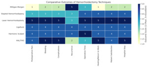 This review studied 50 articles demonstrating substantial heterogeneity in outcomes among operative modalities performed for hemorrhoid treatment. The findings demonstrated that there is not a single universally superior procedure. Each procedure provides a different balance of outcomes, including pain reduction, hemostasis, complication risk, recurrence, and functional recovery. The variable outcomes are attributable to different degrees of tissue disruption, vascular control, anatomical preservation, and energy delivery mechanisms inherent to each technique.1–10 Figure 2 shows different outcomes with variable modalities.