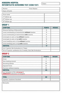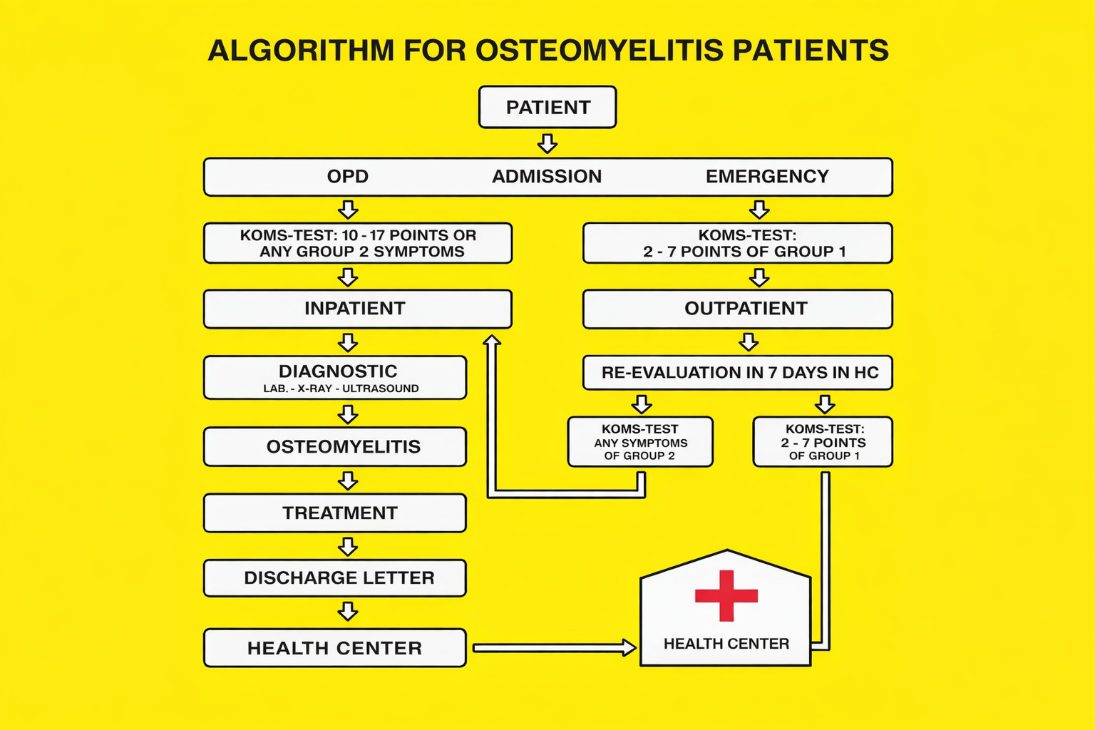There were 15 pages of training material on osteomyelitis written in English and then translated into Kinyarwanda. The guidebook has simplified clinical classification systems adapted from the Comprehensive Rural Surgery model, emphasizing simplified clinical decision-making, decentralization of care, and structured referral pathways suitable for low-resource settings. The KOMS-Test is a new clinical screening tool that uses a symptom-based scoring system to help primary care doctors find osteomyelitis early.